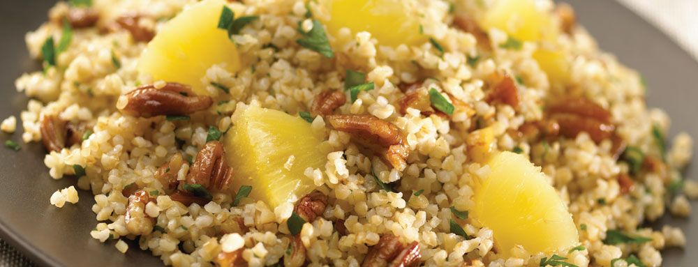- Stir pineapple chunks, pecans, basil, parsley and oil into bulgur. Serve at room temperature.