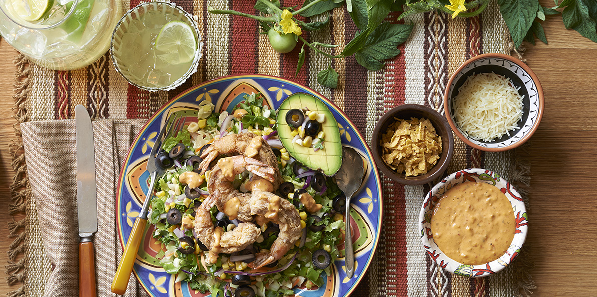 Masa flour is a powdered version of the traditional corn-based dough that’s used to make, among other things, tortillas and tamales. For this quick recipe, we use seasoned masa flour (look for bags of it with Mexican and Latin American foods at your market) to make a crust for flavorful fried shrimp to top our Chopped Chipotle & Cheddar Salad. The addition of olives, corn, red onion and creamy chopped avocado really make this a complete meal-in-a-salad, so no sides are necessary.