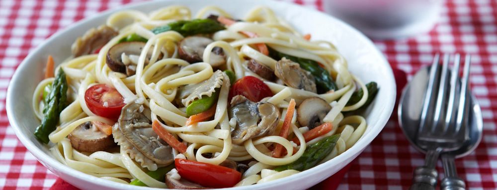 - Meanwhile, heat the oil in a large nonstick skillet over medium-high heat. Add the mushrooms, garlic, salt and pepper. Cook for 5 minutes until mushrooms begin to brown. Add the asparagus, carrots and two tablespoons of water. Toss to combine and cover skillet. Cook 4 minutes longer. Add the tomatoes and the clam juice. Cook uncovered 1 minute longer. If the pasta is not yet al dente, remove vegetables and clams from heat.