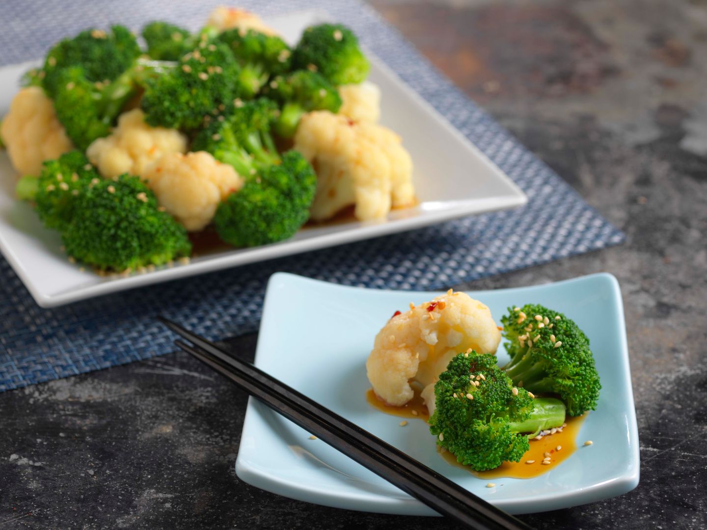 - Place cauliflower and broccoli into serving bowl. Pour dressing over and sprinkle with sesame seeds.